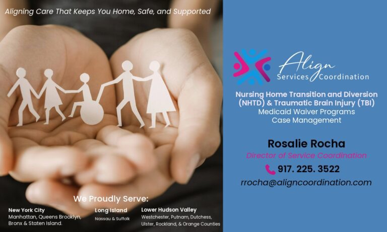 Align Services Coordination helps New Yorkers stay safe at home through Nursing Home Transition and Diversion (NHTD) and Traumatic Brain Injury (TBI) programs, preventing unnecessary nursing home placement. We support families every step of the way across NYC, Long Island, and surrounding counties with personalized, compassionate care coordination services.